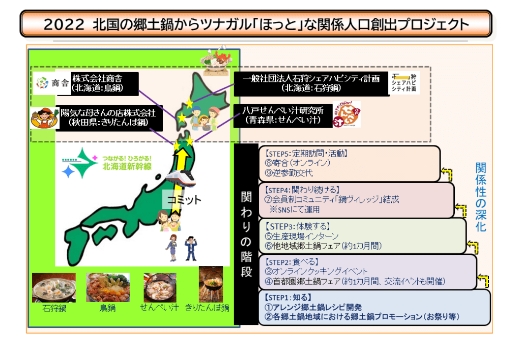 2022年には、内閣府の「関係人口創出・拡大に向けた対流促進事業」の採択を受け、北海道森地域(鳥鍋)、青森県八戸地域(せんべい汁)、秋田県大館地域(きりたんぽ鍋)とタッグを組んだプロジェクトを展開しました。事業期間終了後も、それぞれの地域において各種プロジェクトを鋭意展開しています。